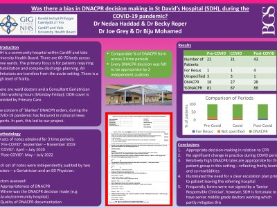 Introduction SDH is a community hospital within Cardiff and Vale University Health Board. There are 60 -70 beds, over three geriatric wards. The primary focus is for patients requiring rehabilitation and complex discharge planning. All admissions are transfers from the acute setting. There is a high level of frailty. There are ward doctors and a consultant geriatrician within working hours (Monday-Friday), OOH cover is provided by primary care. The concern of ‘blanket’ DNACPR orders, during the COVID-19 pandemic has featured in national news reports. In part, this led to our question and audit