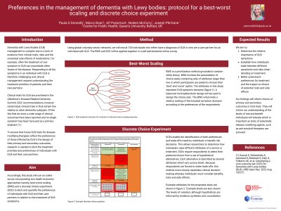 Introduction: At present no single symptom appears to be favoured in choosing primary outcomes for dementia with Lewy bodies (DLB) trials, nor are the perspectives of people affected by DLB reflected in their design. The aim of this study is to elicit the preferences of DLB patients and their care partners with respect to the DLB symptoms that they would most like to see improved upon by a potential therapy. We will do so using two complimentary health economic approaches in a single online survey: a best-worst scaling (BWS) exercise and a discrete choice experiment (DCE). Methods: Using