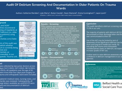 Background NICE and SIGN guidelines recommend screening of inpatients at risk of delirium using the 4AT ( www.the4at.com) and communication of delirium to patients’ General Practitioners (GP). The aim of this audit was to establish whether delirium is currently being screened and documented, as recommended, in our Orthopaedic Trauma unit. Methods Data was collected by two junior doctors across four days (14/11/2022, 29/11/2022, 08/12/2022, 05/02/2023). Trauma and orthopaedic inpatients over the age of 65, who were more than four days post-surgery were included. Each patients’ medical notes