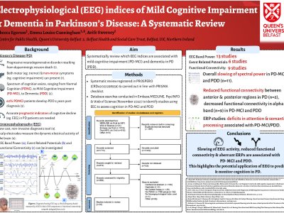 Introduction: Cognitive impairment and dementia are prevalent in Parkinson’s disease (PD) and significantly impact patients’ quality of life. Accurate prognostic indicators of cognitive decline in this population are needed. Electroencephalography (EEG), a non-invasive measure of brain activity, is one such measure. The current study aimed to systematically review which EEG indices are associated with mild cognitive impairment (PD-MCI) and dementia in PD (PDD). Method: A systematic literature search was conducted in Embase, MEDLINE, PsycINFO and Web of Science in November 2022 to identify