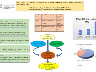 Introduction Frailty is defined as “a condition characterised by loss of biological reserves, failure of physiological mechanisms and consequent increased risk of experiencing a range of adverse outcomes, including hospitalisation, longer length of inpatient stay, and delirium” [1-4]. We aim to investigate the association between baseline frailty and functional recovery amongst hospitalized older adults and its association with inpatient delirium. Method Retrospective analysis of patients admitted to a Geriatrics ward from August to November 2022. Interactions between clinical outcomes with