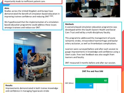 Background and Aims Many medical specialty trainees report a lack of confidence in hyperacute stroke management, contributing to inefficient patient care. We identified a lack of knowledge of our pathways, as well as difficulty managing human factors, particularly communication and teamwork. We hypothesised that the implementation of a simulation-based education programme could address these issues amongst medical specialty trainees and lead to improvements in our door-to-needle (DNT) times. Methods We organised a scenario-based simulation education session for our trainees led by a multi