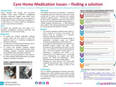 Introduction Across inpatient HSC settings ward based medicines management pharmacy technicians support ward based multi-disciplinary teams. The aim of this study was to explore the potential role and impact of a medicines management pharmacy technician and ‘stock solution’ in a Care Home facility. Method A 30 bedded private Care Home was identified for the pilot. A medicines management pharmacy technician liaised with senior nursing staff to review and understand the monthly medication ordering process. The technician audited the Care Home’s medication destruction records for 4 months and