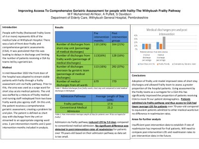 Introduction People with frailty (Rockwood Frailty Score of 4 or more) represents 43% of the medical take at Withybush Hospital. There was a lack of front door frailty and comprehensive geriatric assessments (CGA). It was postulated that this was leading to delays in discharge and limiting the number of patients receiving a CGA by teams led by a geriatrician Methods In mid-November 2022, the acute medical take was adapted to stream stable patients with frailty through a frailty assessment unit. Prior to this, the area was being used as a surge ward for short stay acute medical patients. On the
