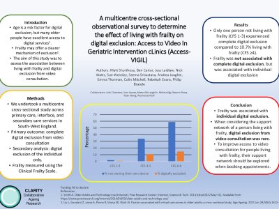 Introduction Age is a risk factor for digital exclusion, but many older people have excellent access to digital services. Frailty may offer a clearer mechanism of exclusion. The aim of this study was to assess the association between living with frailty and digital exclusion from video consultation. Methods We undertook a multicentre cross-sectional study across primary care, interface, and secondary care services in South-West England. Patients were enrolled between 21st February and 12th April 2022. The primary outcome was complete digital exclusion from video consultation (defined as the no