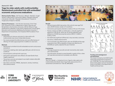 Introduction Older adults with multimorbidity can experience poor health-related quality of life (HRQOL). Yoga has the potential to improve HRQOL. The British Wheel of Yoga’s Gentle Years Yoga© (GYY) programme was developed for older adults with chronic conditions. We investigated the effectiveness and cost-effectiveness of the GYY programme in older adults with multimorbidity. Method This was a multi-site, individually randomised, open, superiority trial with embedded economic and process evaluations. Community-dwelling adults aged ≥65 years with ≥2 chronic conditions were recruited from
