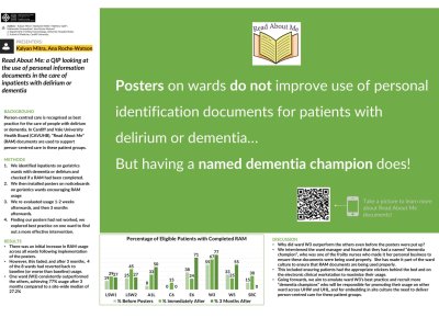 Introduction Person-centred care is recognised as best practice for the care of people with delirium or dementia. In Cardiff and Vale University Health Board (CAVUHB), “Read About Me” (RAM) documents are used to support person-centred care in these patient groups. However, there are significant barriers to their routine use in clinical practice (Clark, E, Wood, F, Wood, S. Health Expect. 2022; 25: 1215- 1231). We conducted a two-cycle audit investigating the use of these documents on geriatric wards in two acute hospital sites, and trialled two interventions to increase their usage. Methods