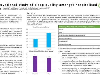 Introduction: Sleep is an essential requirement for good health. The hospital environment is often not compatible with adequate, restorative sleep. Disruption is multifactorial and affecting parameters can be environmental, physical, or psychological. Aims: To observe the difference in sleep quality in patients on medical wards compared with their baseline and highlight areas where sleep quality can be improved. Methods: This observational study analysed patients on four medical wards at Chelsea and Westminster Hospital. Inclusion criteria: Patients with good cognition who had been in hospital