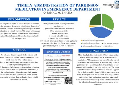 Project Title: Timely administration of Parkinson medication in Emergency Department Background: This project was started to ensure that patients admitted to the emergency department with a known diagnosis of Parkinson’s disease are receiving their anti-parkinsonian medications in a timely manner. This would help manage their symptoms, prevent complications, decrease their length of hospital stay and lessen the diagnostic burden on the department. Project methodology: Data source for identifying the audit population: Patient notes and discharge summaries Audit population: Patients with known