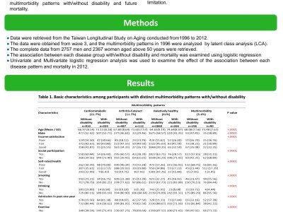 Background: Multimorbidity patterns is associated with future mortality among older adutls. However, the addictive effect of disability for distinct multimorbidity patters is unclear. Our aim was to identify the multimorbidity patterns of Taiwanese people aged over 50 years and to explore their association between multimorbidity patterns with/without disability and future mortality. Methods: This longitudinal cohort study used data from the Taiwan Longitudinal Study on Aging. The data were obtained from wave 3, and the multimorbidity patterns in 1996, 1999, 2003, 2007, and 2011 were analyzed