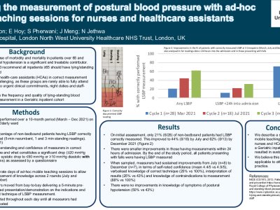 Introduction Falls are a major cause of morbidity and mortality in patients over 65. Unrecognised postural hypotension is a significant and treatable contributor. Training nurses and health-care assistants (HCAs) in correct measurement technique can be challenging, as these groups are rarely able to fully attend single sessions due to urgent clinical commitments, night duties and staff-shortages. We aimed to improve the frequency and quality of lying-standing blood pressure (LSBP) measurement in a Geriatric inpatient cohort. Methods 3 PDSA cycles were performed over a 10-month period on a