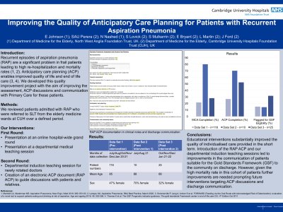 Introduction: Recurrent episodes of aspiration pneumonia (RAP) are a significant problem in frail patients leading to high re-hospitalization and mortality rates. Anticipatory care planning (ACP) enables improved quality of life and end of life care. We reviewed the assessment, ACP discussions and communication with Primary Care for patients admitted with RAP. Methods: We used PDSA methodology, reviewing patients with RAP referred to Speech and Language Therapy (SLT) in Elderly Medicine wards. Educational interventions were implemented. An illustrative case and pre-intervention results were