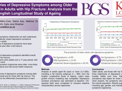 Background This study aimed to determine trajectories of depressive symptoms among older adults in England, overall and for those with hip fracture. The study aimed to explore the differential characteristics of each trajectory identified. Methods Analysis of adults aged 60 years or more (n=7,050), including a hip fracture subgroup (n = 384), from the English Longitudinal Study of Ageing. Latent class growth mixture modelling was completed. Depressive symptom prevalence was estimated at baseline. Chi-squared tests were completed to compare baseline characteristics across trajectories. Results