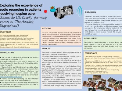Introduction The therapeutic benefits of narrative in terminally ill patients is widely studied and evidenced in the research literature. The Hospice Biographers are a charity offering a professional free service for end-of-life patients the opportunity to audio-record their life story in a memory stick and to keep copies for themselves and for their families. The objective of this qualitative study is to explore the experience of a group of people either recording or listening to an audio-biography. Methods Five semi-structured in-depth interviews with terminally ill adults who recorded an
