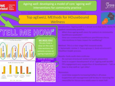 Introduction Empowering patients to ‘age well’ (NHS England Long Term Plan, 2019) has become a key driver to meet the rising demand for healthcare. Despite a growing body of evidence regarding ageing well and the benefits of patient empowerment (Selman et al, 2017) and reducing demand on resources (Age UK, 2020), there remains confusion regarding applied meaning for the spectrum of older persons health. This research will consider expert view on the topic of ‘ageing well’ related to the predictable patterns of ageing. The aims of this study will be to develop a new interventional frailty