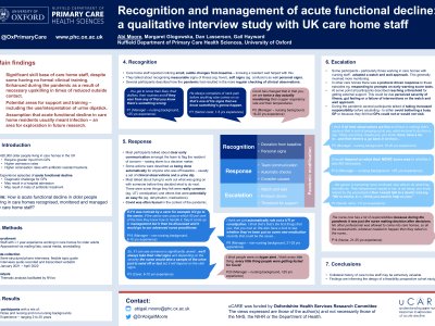 Introduction Older people living in care homes sometimes experience episodes of acute functional decline. These represent a diagnostic challenge to healthcare professionals and can result in antibiotic prescriptions or hospital admissions, though this may not always the most appropriate management strategy. We aimed to understand how episodes of acute functional decline are recognised, managed and escalated by care home staff in the UK. Method This was a qualitative interview study with UK care home staff, including managers, nurses and carers. Participants were recruited through