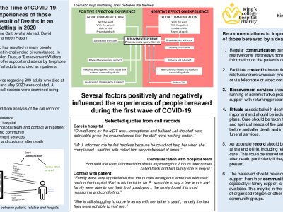 Introduction: The COVID-19 pandemic has resulted in many people experiencing bereavement in challenging circumstances. In April 2020 at a large London Trust, a “Bereavement Welfare Hub” (BWH) was established to offer support and advice by telephone to relatives and carers of all adults who died as inpatients. Data from these calls has been used to examine and learn from experiences of the bereaved at this time. Methods: Data from BWH call records regarding 809 adults who died at the Trust in March - May 2020 were collated and analysed quantitatively. A random selection of 149 call records were