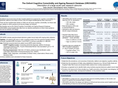 Background: Guidelines recommend that all older hospital patients are screened for cognitive comorbidity (i.e. dementia, delirium) and frailty to inform care and target multidisciplinary team resources, based mainly on evidence from studies in elective or specialty-specific settings. Unselected hospital-wide data are needed to inform guidance and service design and delivery, so we set up the Oxford Cognitive Comorbidity and Ageing Research Database (ORCHARD) using routinely-acquired electronic patient record (EPR) data. Methods: ORCHARD includes pseudonymised EPR data on all patients >65 years