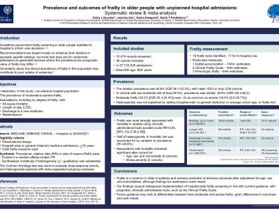 Background: Guidelines recommend screening for frailty in all hospitalised older adults to inform care, based mainly on studies in elective and speciality-specific settings. However, most hospital bed-days in older people are for acute, non-elective admissions to general medicine, for which the prevalence and prognostic value of frailty might differ. Therefore, we undertook a systematic review of frailty prevalence and outcomes in older people with unplanned hospital admissions. Methods: We searched MEDLINE, EMBASE and CINAHL up to 30/04/2021 for observational studies using validated frailty
