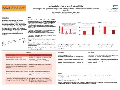 Introduction: Neck of femur fractures (NOFFs) are a clinically significant diagnosis, with 10% of patients dying within one month of diagnosis [1]. There is a strong association between earlier surgery and improvement in postoperative outcomes [2]. Taking anticoagulation can cause delays in patients being operated on. At Homerton University Hospital (HUH), no previous guideline existed to aid specifically in the management of patients with NOFFs on anticoagulation. We created a guideline in order to reduce delays to theatre, in keeping with national guidance (