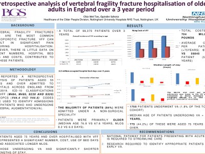 Introduction Vertebral fragility fractures (VFF) are the most common osteoporotic fracture. VFF can result in significant pain requiring hospitalisation. However, there is little data on patient numbers, hospital bed days and costs, contributed to by these patients. Methodology We report a retrospective analysis of patients aged 55 years and over admitted to hospitals across England from 2017-2019. ICD-10 classifications for VFF and OPCS codes were used to identify admissions and patients who had undergone vertebral augmentation (VA). Results There were a total of 99,240 patients (61% Female)