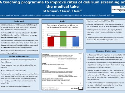 Introduction NICE Clinical Guideline CG103 states that adults aged 65 and older should be screened for delirium within 48 hours of emergency hospital admission. The Geriatric Medicine Research Collaborative (GeMRC)'s World Delirium Day data from 2019 showed an average screening rate of 27% nationally. After an inpatient fall on the Medical Assessment Unit resulted in hip fracture for a patient who had not been screened for delirium with the recommended 4 A's Test (4AT), we decided to collect data on screening rates and devised a way of improving these. Method Baseline data was collected