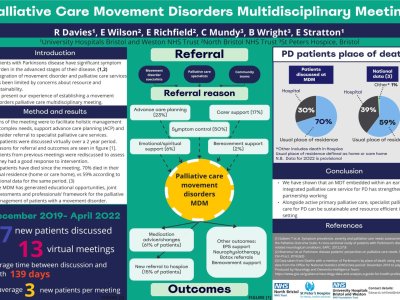 Introduction It is well recognised that patients with Parkinson’s disease (PD) have significant symptom burden in advanced stages of their disease. Integration of movement disorder and palliative care services has been limited by concerns about resource and sustainability. We present our experience of establishing a movement disorders palliative care multidisciplinary meeting. Method In 2019 we established a multidisciplinary virtual bimonthly meeting between movement disorders and palliative care specialists. Referrals were accepted from movement disorder specialists, community Parkinson’s