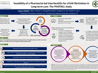 Introduction: Older people in care homes with atrial fibrillation (AF) have complex health needs and would benefit from taking part in research. This study assessed the feasibility of pharmacist implementation of the Atrial Fibrillation Better Care (ABC: Anticoagulation; Better symptoms; Cardiovascular comorbidity management) pathway, and collection of an AF-specific, resident-centred outcome. Methods: Older residents (aged ≥65 years) with AF were recruited from care homes within Liverpool and Sefton and randomised to receive the pharmacist intervention, or continue their existing treatment