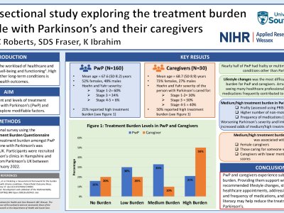 Introduction Treatment burden is the workload of healthcare and its impact on patient well-being and functioning. High treatment burden in other long-term conditions is associated with poor health outcomes. This study aimed to determine the extent and levels of treatment burden among people with Parkinson’s (PwP) and their caregivers, and explore modifiable factors. Methods A cross-sectional survey using the Multimorbidity Treatment Burden Questionnaire (MTBQ) to measure treatment burden was conducted among adults (age >18 years) diagnosed with Parkinson’s or self-identified caregivers of