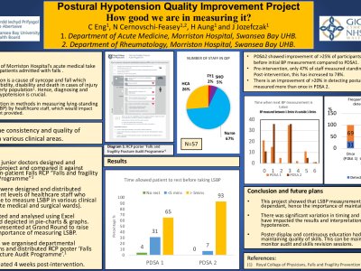 Introduction: A large proportion of Morriston Hospital’s acute medical take consists of elderly patients admitted with falls. Postural hypotension is a cause of syncope and fall which contributes to morbidity, disability and death in cases of injury in the frail and elderly population 1. Hence, diagnosing and treating postural hypotension is crucial. It is important that the measurement of lying-standing blood pressure (LSBP) is consistent to ensure reliability of results as this would affect patients’ management. The aim of this project is to assess how postural hypotension is diagnosed in