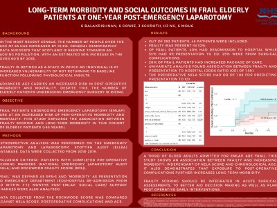 Objective: Frailty patients undergoing emergency laparotomy (EmLap) experienced increased perioperative morbidity and mortality. We aim to explore the association between frailty scoring in EmLap older adults (>65 years) and 1-year post-operative morbidity and social care changes. Methods: Retrospective analysis was performed on the Emergency Laparotomy and Laparoscopic Scottish Audit (ELLSA) database (2018-2019). Older adults with completed preoperative scoring markers (National Emergency Laparotomy Audit (NELA) and Rockwood Frailty Score (RFS)) were included. ‘Frail’ was defined as RFS>3 and