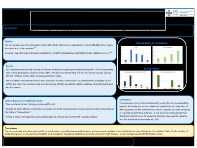 Introduction By 2030, it is estimated that 25% of Europeans will be aged over 65.[Dugarova;UNDevelopmentProgramme;2017] Frailty in this group is a key contributor to poorer outcomes.[Eamer;BMCAnesthesiology;2017;17:99] The term is common in healthcare but research into the issues faced by staff around assessment and management of frailty has been limited. We undertook a survey to identify challenges faced in providing care to those living with frailty and considered potential interventions. Method The survey was across three hospitals in our health board (which serves a population of around