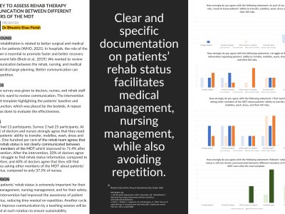 BACKGROUND Physical rehabilitation is related to better surgical and medical outcomes for patients (WHO, 2021). In hospitals, the role of the rehab team is essential to promote faster and better recovery and to prevent falls (Brett et al., 2019). We wanted to review the communication between the rehab, nursing, and medical team to aid discharge planning. Better communication can reduce repetition. METHODS A baseline survey was given to doctors, nurses, and rehab staff in a geriatric ward to review communication. The intervention was an A4 template highlighting the patients’ baseline and