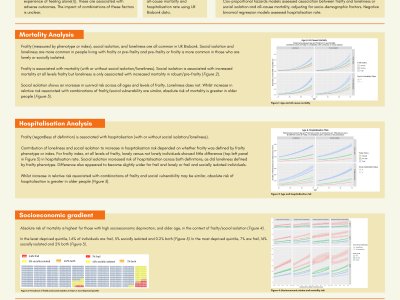 Background : Three challenges for ageing populations are frailty (a state of reduced physiological reserve), social isolation (objective lack of social connections), and loneliness (subjective experience of feeling alone). These are associated with adverse outcomes. This study aims to examine how frailty in combination with loneliness or social isolation is associated with all-cause mortality and hospitalisation rate using data from UK Biobank, a large population-based research cohort. Methods: 502,456 UK Biobank participants were recruited 2006-2010. Baseline data assessed frailty (via two