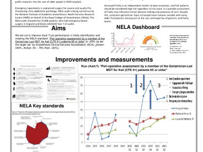 Title: Care of Older People undergoing emergency surgery: meeting the standards of the National Emergency Laparotomy Audit (NELA) Introduction: There are well documented in-equalities for outcomes for surgical intervention 1,2,3 associated with Age and Frailty including emergency laparotomy 4. NELA data has shown over half of such patients are over 65 years old about one fifth are over 80. These patients having significantly higher mortality, longer hospital stays and it has also shown frailty to be an independent marker of poor outcomes. Through application of key standards these outcomes