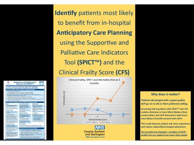 Introduction Patients with frailty who have emergency admissions are at risk of mortality and may benefit from Anticipatory Care Planning (ACP). Appropriate identification, to target limited resource in an in-patient environment can be challenging. We conducted a prospective study on a cohort of frail in-patients with a hospital admission of ≥ 72 hours duration. We aimed to evaluate the effectiveness of the SPICT tool alongside Clinical Frailty Score (CFS) as a predictor of mortality to improve our targeting of patients for ACP. Method. On a single day a SPICT form was completed prospectively