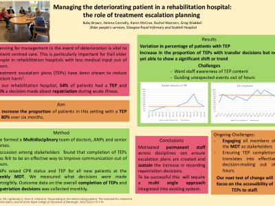 Introduction: The pandemic has shown how vital patient-centred treatment escalation planning (TEP) is for older people. Locally we have seen inappropriate transfer of dying patients to acute hospitals from rehabilitation units. Mortality review found a lack of useful TEPs in these cases. Baseline data in our rehabilitation hospital showed 54% of patients had a TEP and 16% a decision made about repatriation during acute illness. We aimed to increase the proportion of patients in this setting with a TEP to 80% over six months. Methods: A multidisciplinary team of doctors, ANPs and senior nurses