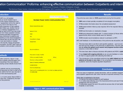 Introduction The Norman Power Centre (NPC) is a 32 bedded Intermediate Care Unit, run by an acute hospital trust in Birmingham, UK, for patients who require ongoing 24 hour care, rehabilitation or further assessment, but do not need to be in an acute hospital setting. These frail patients attend numerous outpatient hospital appointments, but rarely do staff receive communication back from these outpatient reviews. This can lead to delays in implementing specialist management plans, with potential for adverse outcomes for patients and increased staff workload in seeking out the required
