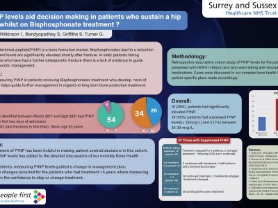Introduction: Procollagen-N-terminal-peptide(P1NP) is a bone formation marker. Bisphosphonates lead to a reduction in P1NP levels and levels are significantly elevated shortly after fracture. In older patients taking bisphosphonates who have had a further osteoporotic fracture there is a lack of evidence to guide ongoing osteoporotic management. Objectives: To assess if measuring P1NP in patients receiving Bisphosphonates treatment who develop neck of femur fractures helps guide further management in regards to long term bone protection treatment. Methodology: Retrospective descriptive cohort