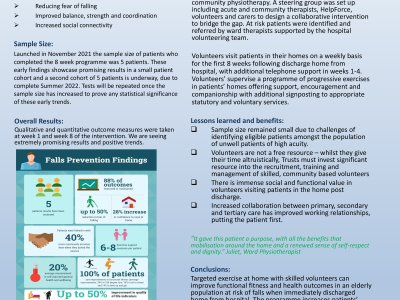 Introduction Covid has had a devastating effect on the Elderly, resulting in deconditioning, increased falls and loneliness. Tailored exercises can reduce falls in people aged over 65 by 54% and participation in physical activity reduces the risk of hip fractures by 50%, currently costing the NHS £1.7 billion per year in England. This 8 week intervention delivered by trained volunteers in patient’s homes, aims to reduce deconditioning, loneliness and the risk, incidence and fear of falling (FOF) amongst frail patients post-discharge from hospital. Method A gap in service was identified in