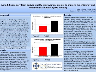 Working in a small district general hospital in Llanelli, West Wales, a weekly hybrid multi-disciplinary team (MDT) meeting is held on the stroke and care of the elderly unit. There are 3 separate geriatric teams covering the ward. Typically, these meetings are attended by physiotherapists, occupational therapists, speech and language therapists, discharge nurses, social workers, nurses and a doctor. The main agenda is to discuss the patients’ current medical issues, rehabilitation needs and likely discharge destination/complexities. Medically, these meetings were attended by a single doctor
