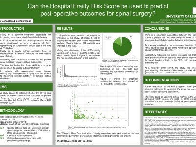 Introduction Frailty is a syndrome associated with increasing numbers of elderly hospital admissions and prolonged inpatient stays (Archibald et al, Geriatrics, 2020, 20, 17). In 2015, an estimated 14% of inpatients in the UK were considered to have a degree of frailty, representing an approximate annual cost to the NHS of £5.8 billion (Soong et al, BMJ Open, 2015, 5, e008456; Han et al, Age and Aging, 2019, 48, 665-671). Frailty is poorly defined; there are discrepancies in existing literature on how to best quantify frailty. It is recognised there is a higher risk of adverse outcomes in this