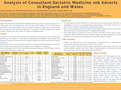 Introduction The British Geriatrics Society (BGS) Flexible Workforce Statement supports national policy such as the NHS People Plan in promoting less than full time (LTFT) working.1,2 As LTFT trainee representatives on the BGS Trainees' Council we were interested to know how consultant work patterns are advertised. We analysed job adverts for Consultants in Geriatric Medicine over a two-year period to identify how many were LTFT posts. Method A freedom of information (FOI) request was submitted to online recruitment website ‘NHS Jobs’. The request identified jobs in ‘Elderly Care Medicine’ OR