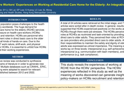 Introduction: The ageing population poses challenges to the health care industry worldwide. The huge demand for residential care home for the elderly (RCHE) services induces pressure on health care workers (HCWs) recruitment and retention. HCWs are personnel who have prominent roles in direct basic care to the older adults, and all kinds of hands-on care. Due to the “unpleasant” work nature, shift work, and physical demands for HCWs, it is essential to unfold how HCWs comprehend their working experiences. Methods: An integrative review was conducted to synthesize various streams of literature
