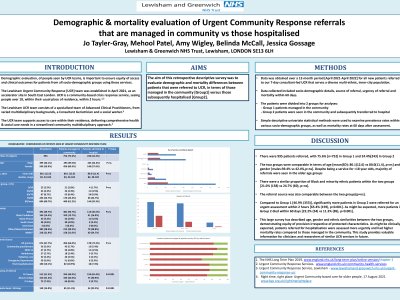 Introduction Demographic evaluation of urgent community response teams [UCR] is important to ensure equity of access and clinical outcomes for patients from all socio-demographic groups using such services. This retrospective descriptive study aimed to evaluate demographic and mortality differences between patients referred to UCR in terms of those managed in the community [Group1] versus those subsequently hospitalised [Group2]. Methods Data was obtained over a 12-month period [2021-2022] for all new patients referred to a 7-day consultant-led UCR that serves a multi-ethnic, inner-city
