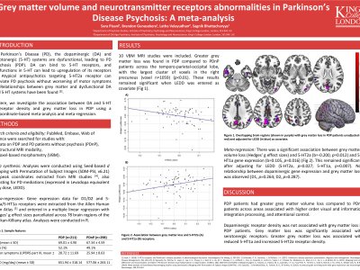 Introduction: Recent evidence suggests extensive grey matter abnormalities in Parkinson’s Disease Psychosis (PDP), as well as dysfunction of dopaminergic and serotonergic receptors. However, findings remain unclear. This meta-analysis aimed to identify neuroanatomical correlates of PDP and to examine the relationship between grey matter and key candidate receptors. Method: Peak coordinates were extracted from structural magnetic resonance imaging (MRI) studies (identified through systematic searches on PubMed, Web of Science, and Embase) for PDP patients and Parkinson's Disease patients
