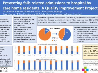 Introduction: According to the Health Education England (HEE) Framework for Enhanced Health in Care Homes 2020, 33% of people over 65 and 50% of people over 80 have one or more fall a year, figures which significantly increase in care home residents. Prevention of falls promotes the quality of life of elderly patients and could significantly reduce the burden on primary and secondary care stemming from fall induced fractures, loss of mobility and community follow up. The Comprehensive Geriatric Assessment (CGA) for falls includes a full falls assessment questionnaire, medication review, lying