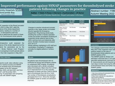Background - The CQC inspection of the Royal Lancaster Infirmary (RLI) in May 2021 rated the performance of the stroke department unsatisfactory, leading to a number of changes. A retrospective audit was performed to determine the impact of these changes for thrombolysed stroke patients. Aim – This retrospective audit assessed the performance of the stroke department at the RLI against the parameters set by the ‘Sentinel Stroke National Audit Program’ (SSNAP), comparing 6-month periods before and after the CQC inspection in May 2021. Method – Using electronic medical records and SSNAP data, we