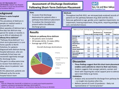Introduction “Pathway three delirium” is a short-term placement in a care home specific to North Yorkshire, for patients diagnosed with delirium during hospital admission, who are medically fit but have not recovered cognitively enough for discharge home. The goal is to allow extra time to recover from delirium, to allow return to patients’ own homes. At this placement, patients are followed up by the acute hospital liaison team. Aims To assess final discharge destinations after pathway three delirium placement. To analyse characteristics between discharge groups. Methods We analysed