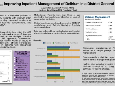 Background: Delirium is a common clinical condition associated with increased morbidity and mortality, and prolonged hospital stay. Early detection is vital to improving management of the condition and improving outcomes. Our aims: improve delirium detection using the 4AT screening tool as a validated approach, Improve delirium management across multiple domains using the PINCH ME approach; documented attempt at collateral history within 24 hours of recognition of delirium; obtain serological confusion screen in patients with recognised delirium. (100% each) Methodology: Plan Do Study Act